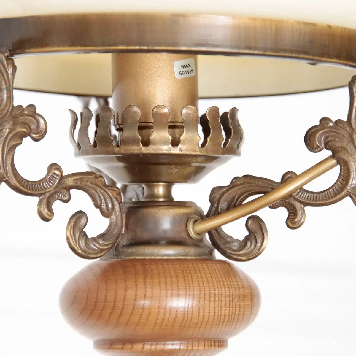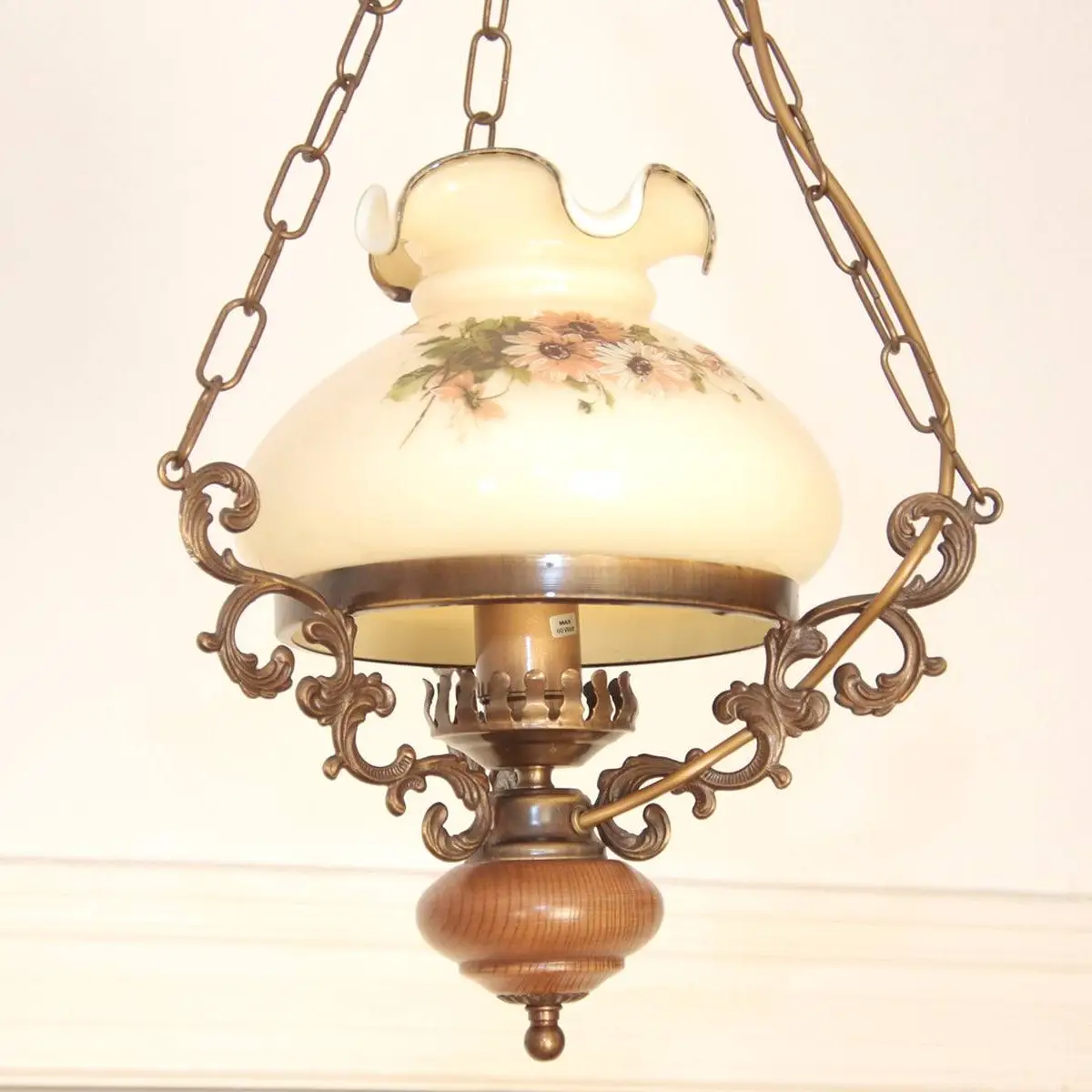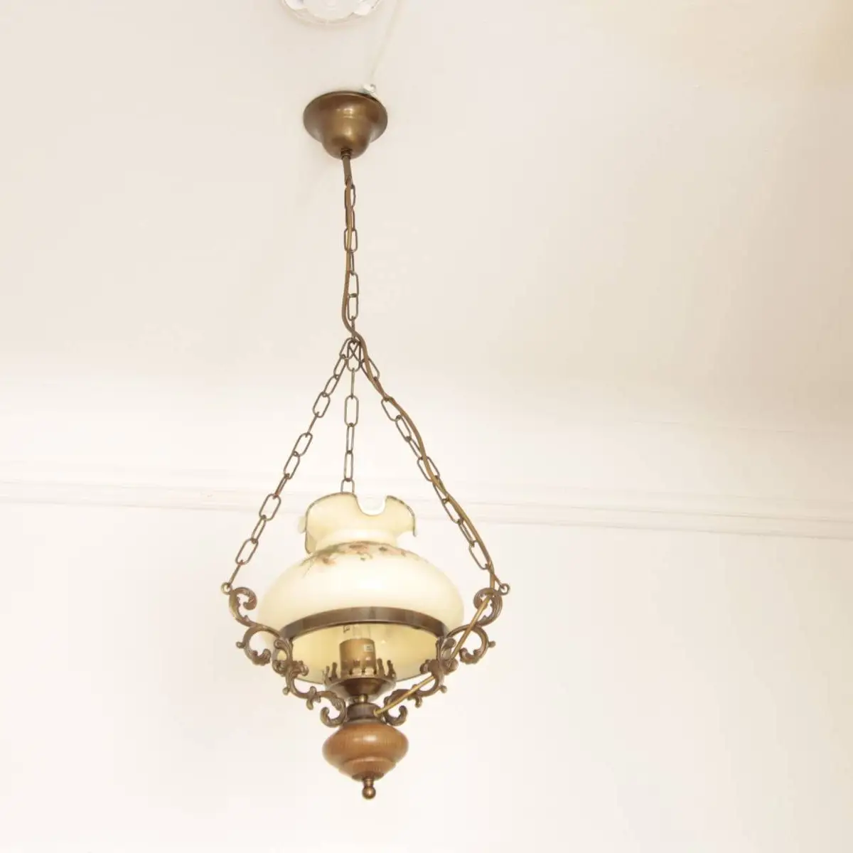 Deckenlampe beziehungsweise Hängelampe aus massivem Messing und sorgfältig verarbeitetem Holz, kombiniert mit einem klassischen Petroleum-Glasschirm aus hochwertigem Opalglas. Dieses besondere Beleuchtungsobjekt stammt aus den 1970er-Jahren und befindet sich in einem sehr guten Zustand, was sowohl die Funktionalität als auch die optische Erscheinung betrifft. Die harmonische Verbindung der Materialien sorgt für eine warme und zugleich stilvolle Ausstrahlung, die sich sowohl in traditionellen als auch in modern interpretierten Wohnkonzepten hervorragend integrieren lässt.