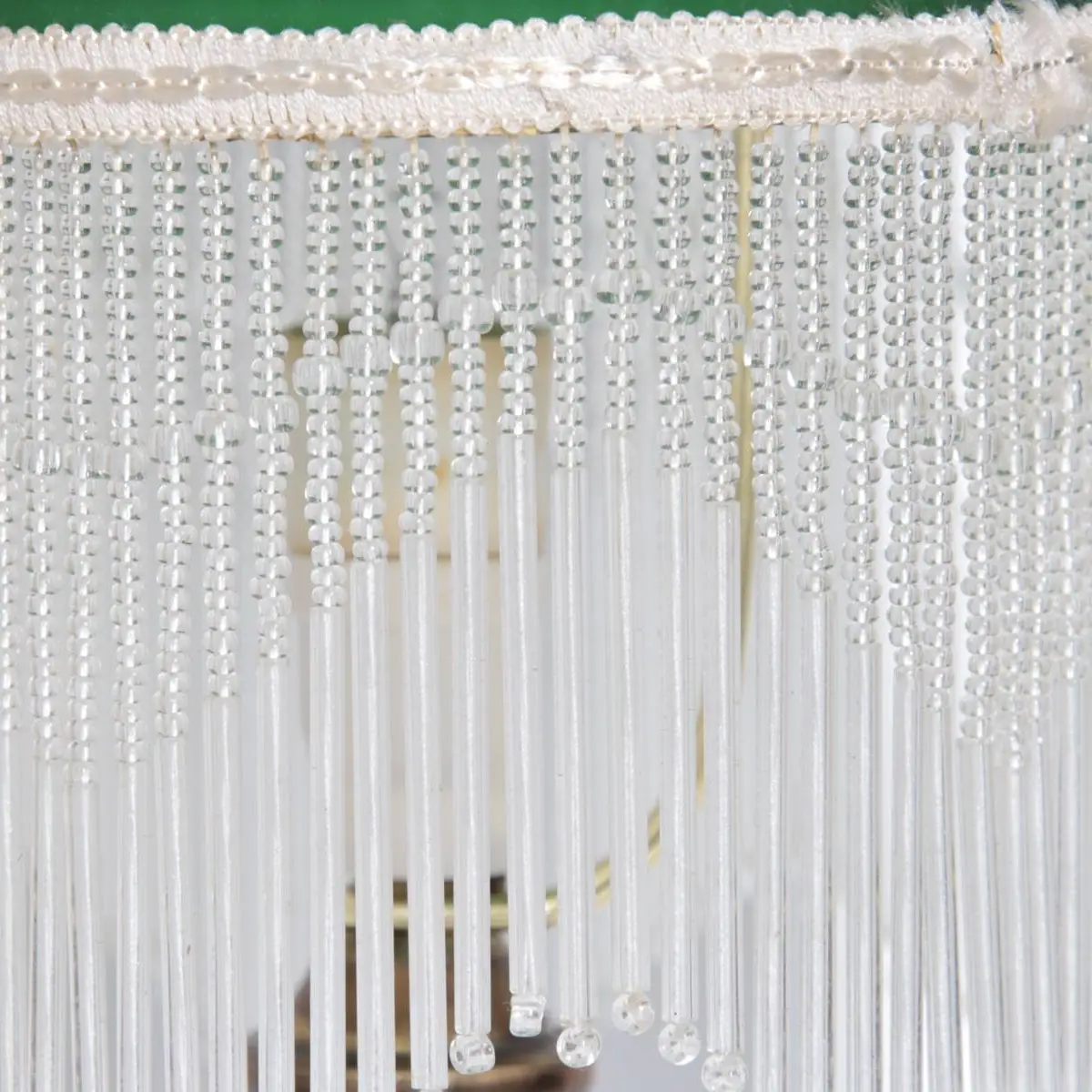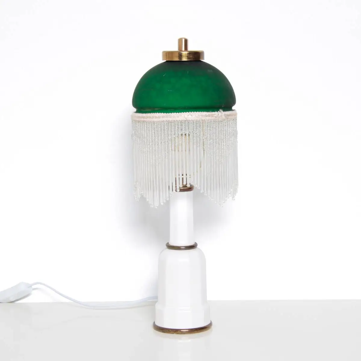Porzellan-Messing-Tischlampe mit verziertem grünem Opalglasschirm und langen Glasperlenfransen. Original 1970er-Jahre, mit leichten Gebrauchsspuren (siehe Bilder).