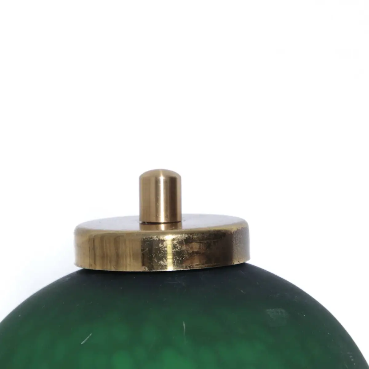 Besonderes Augenmerk liegt auf dem kunstvoll gestalteten Opalglasschirm in einem satten Grünton. Das Glas ist verziert gearbeitet und sorgt für eine weiche, gleichmäßige Lichtstreuung. Durch die opale Struktur entsteht eine angenehme, gedämpfte Beleuchtung, die sowohl funktional als auch atmosphärisch wirkt. Der Farbton des Glases fügt sich harmonisch in unterschiedliche Einrichtungsstile ein und verweist zugleich auf den typischen Geschmack der Mid-Century– und späten Vintage-Phase.