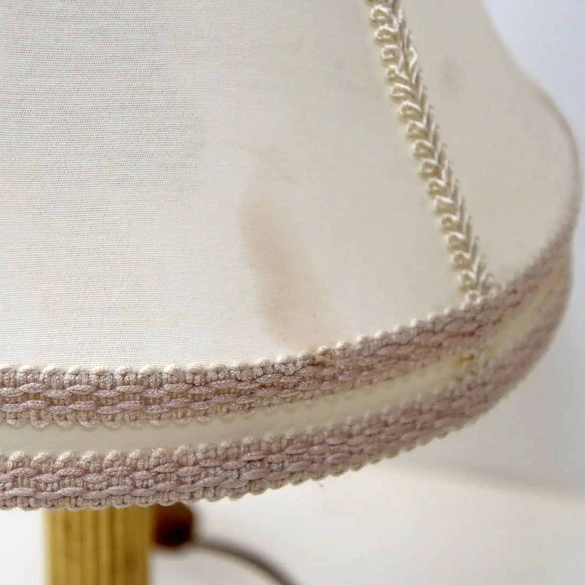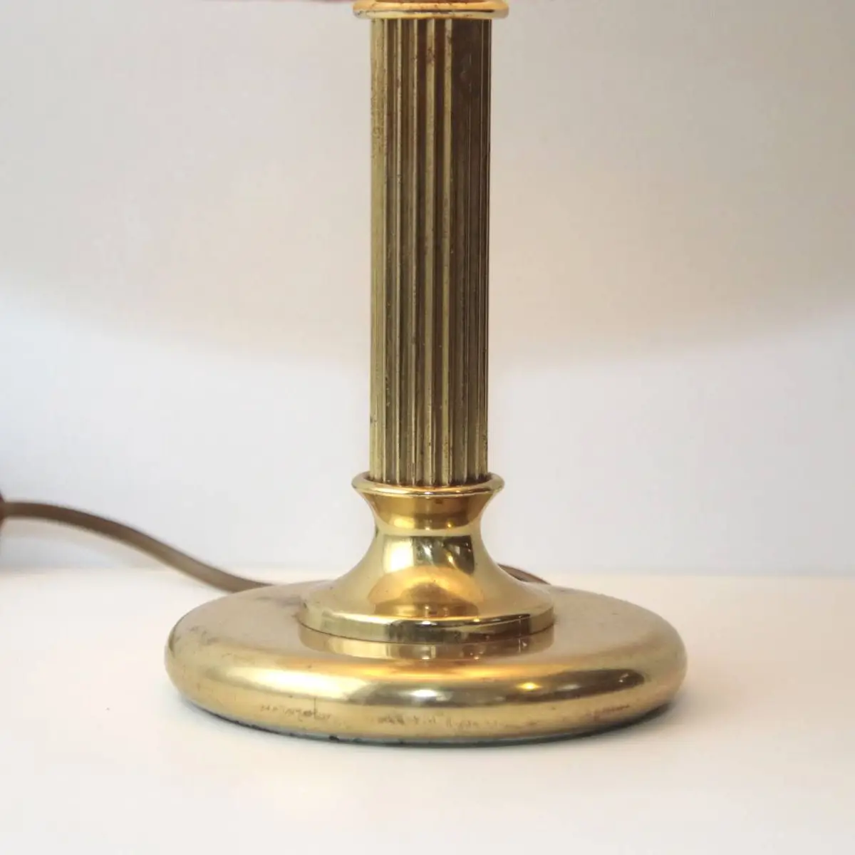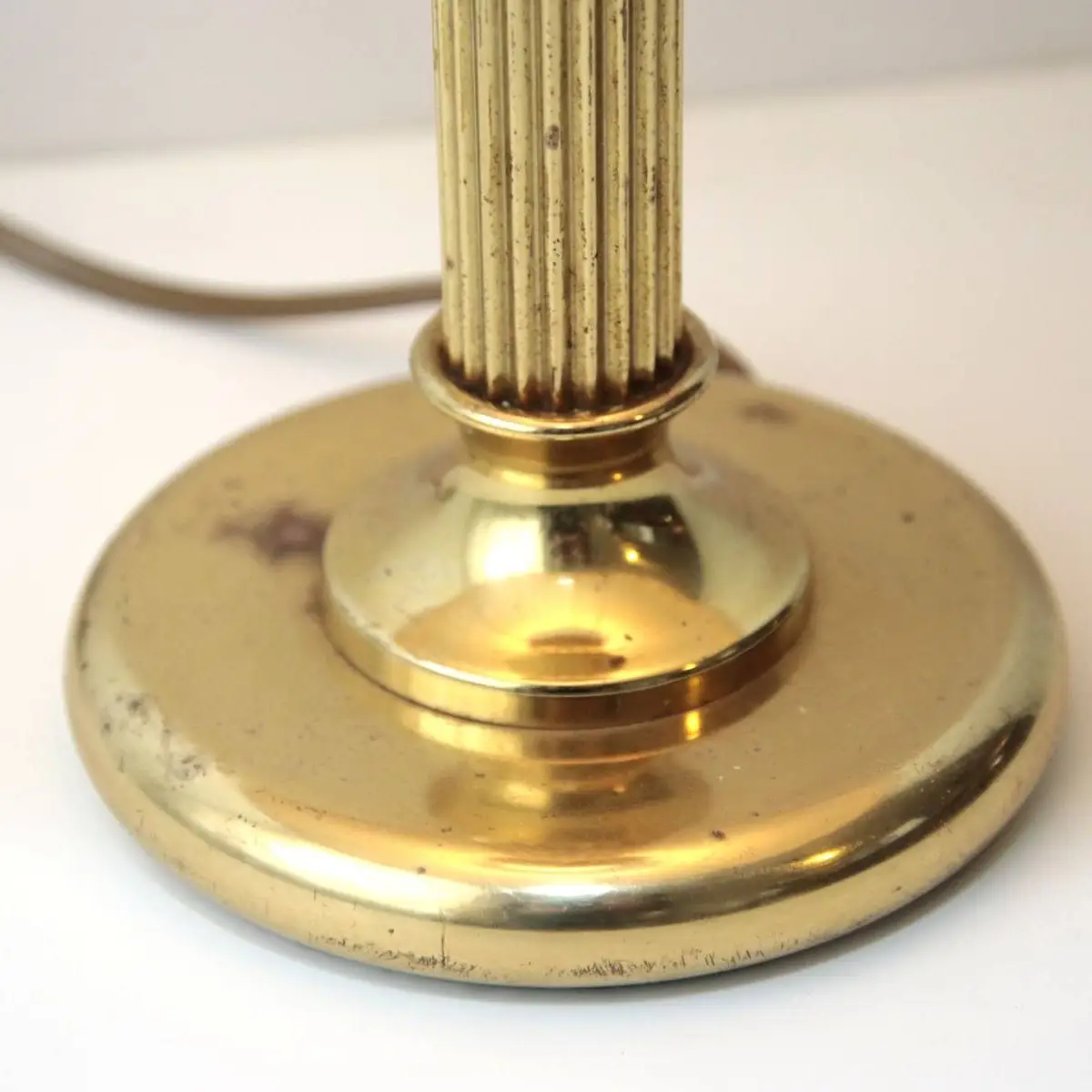 Gebrauchsspuren an der LeuchteTischlampe aus den 1970er Jahren in hochwertiger Ausführung aus Messing, kombiniert mit einem klassischen Lampenschirm und einer dekorativen Stoffbordüre. Dieses charaktervolle Beleuchtungsobjekt verkörpert die stiltypische Formensprache dieser Epoche und verbindet funktionale Eleganz mit dekorativem Anspruch. Das fein gearbeitete Messinggestell überzeugt durch seine warme, goldene Ausstrahlung und verleiht der Leuchte eine zeitlose Präsenz, die sowohl in klassischen als auch in modernen Einrichtungskonzepten harmonisch wirkt.